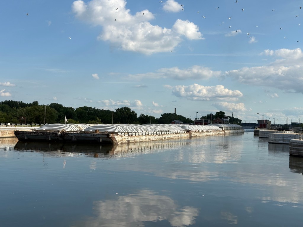 Once we go through the city, there wasn’t much of a view… A lot of industrial sites along the Illinois River. We got stuck for a while at a train bridge waiting for the trains to go through before we could pass.