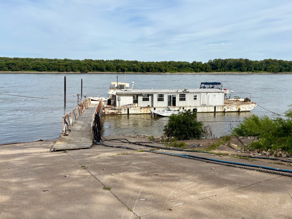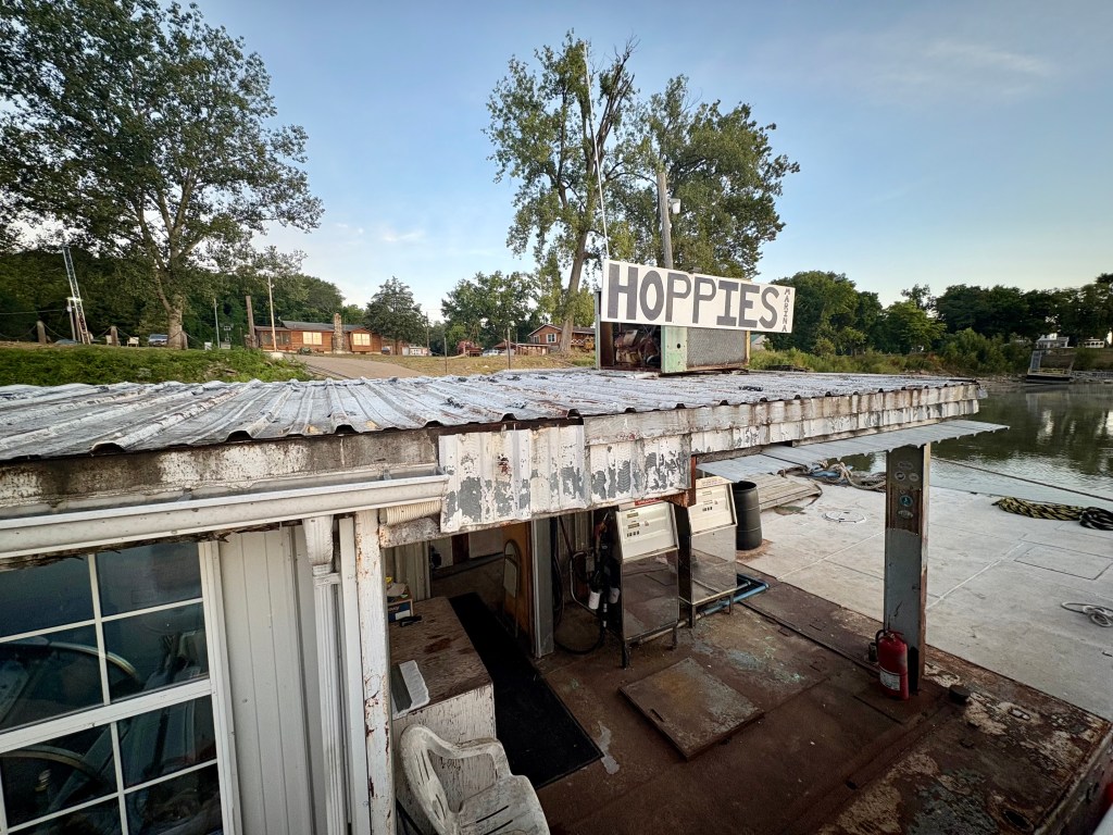 First, we found out from our buddy boat that the lock we wanted to tie up to was under construction and closed to private boats. Then it took waaaay longer to get through the locks than we planned. So we ended up going only about 45 miles, instead of the planned 85, and staying at Hoppies Marina in Kimmswick, MO. Hoppies is basically a rusty barge with fuel, water, electricity and tie ups for 2-3 boats. We actually also stayed at Hoppies last year, heading up the Mississippi. This year, Hoppies has experienced some unfortunate damage, and is even smaller than before, with room for just two boats.