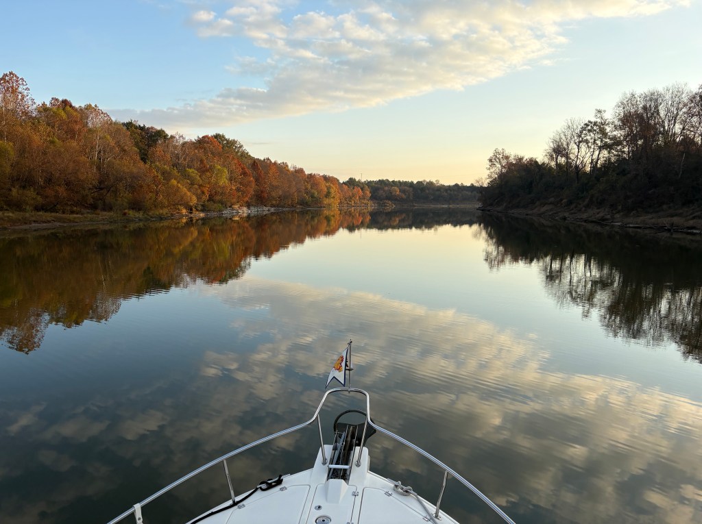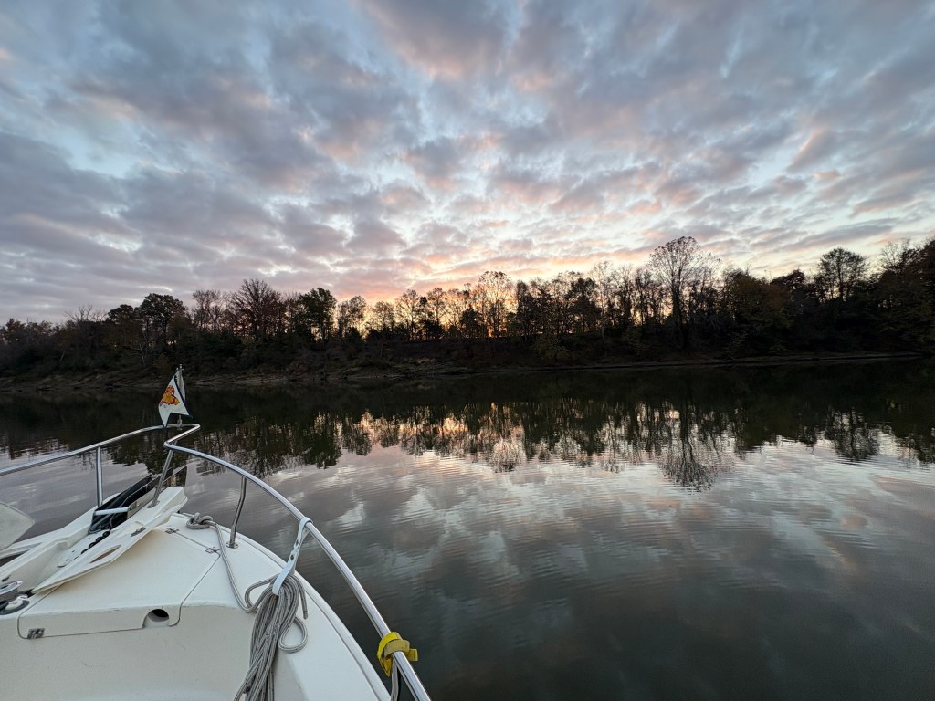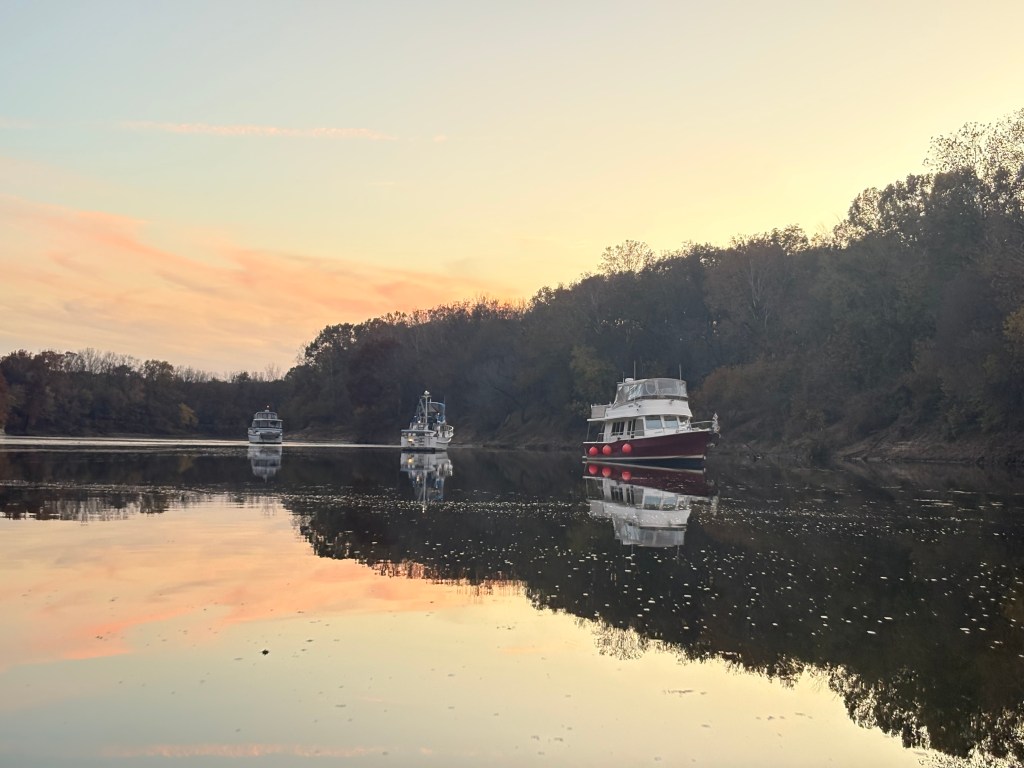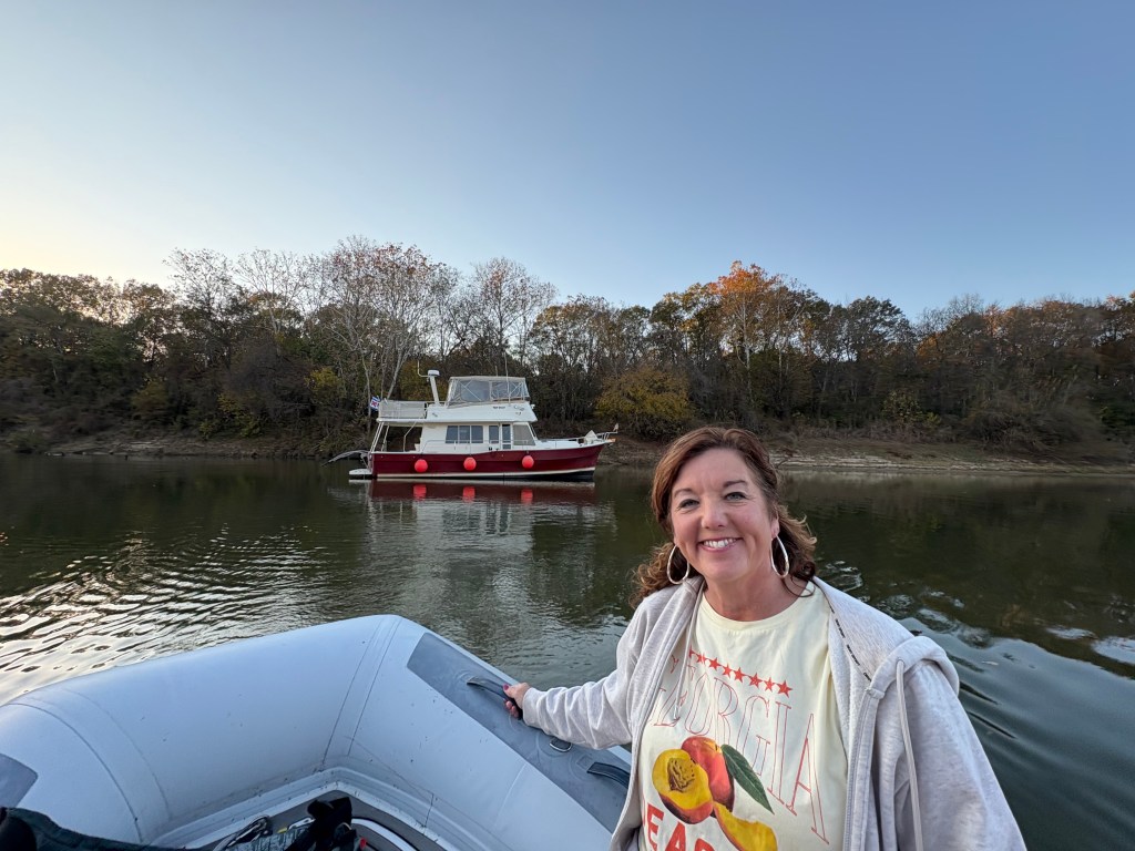 We spent the night “on the hook” as boaters call anchoring out. We anchored with 8 other boats in a quiet channel off the river near Gainesville, AL. We have now traveled through 8 states MI, IN, IL, MO, KN, TN, MS, and AL . We also were able to take our dinghy “Mini Pearl” to shore and get a walk in before dark.