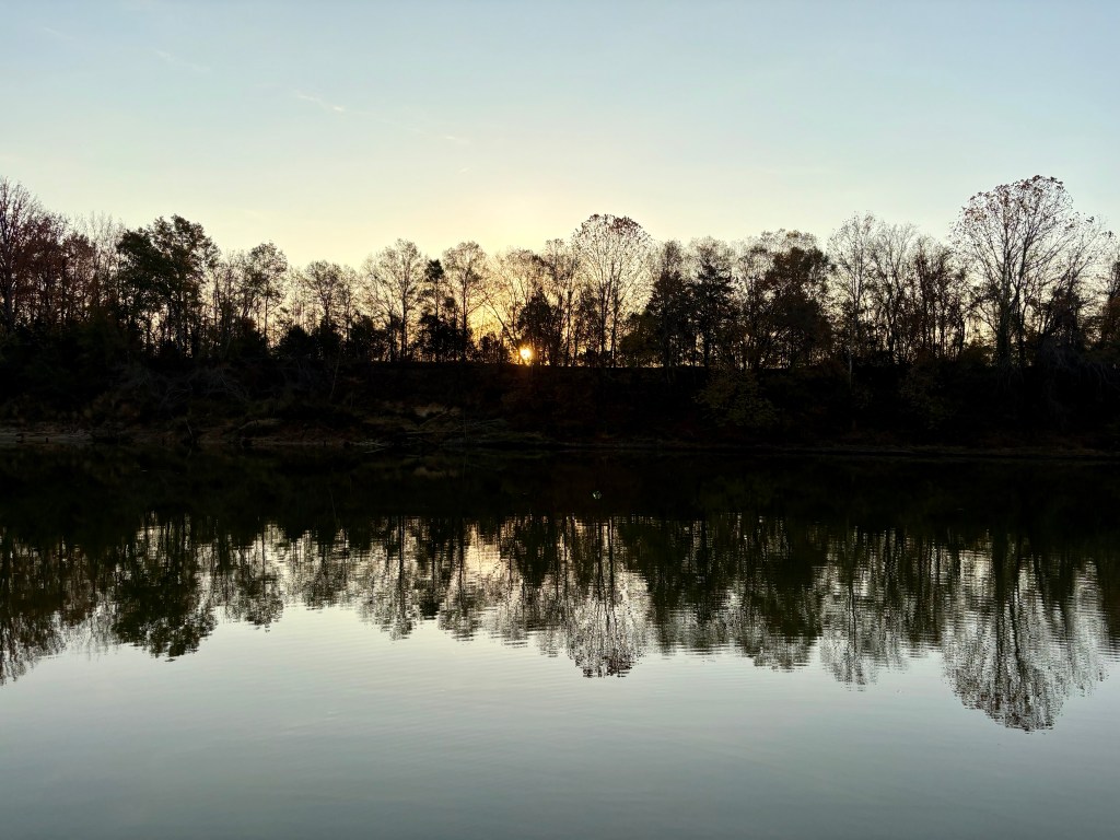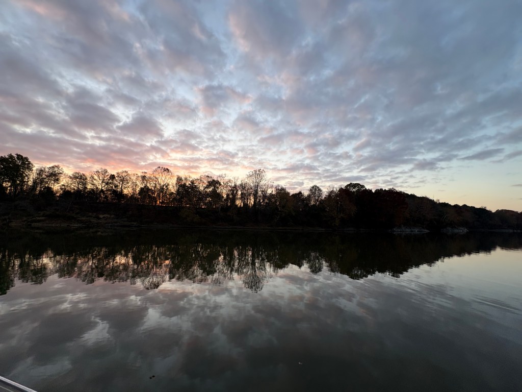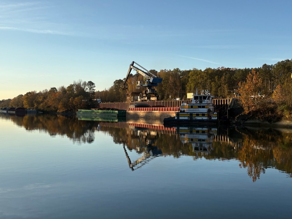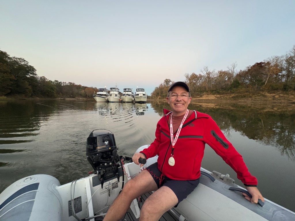 We spent the night “on the hook” as boaters call anchoring out. We anchored with 8 other boats in a quiet channel off the river near Gainesville, AL. We have now traveled through 8 states MI, IN, IL, MO, KN, TN, MS, and AL . We also were able to take our dinghy “Mini Pearl” to shore and get a walk in before dark.