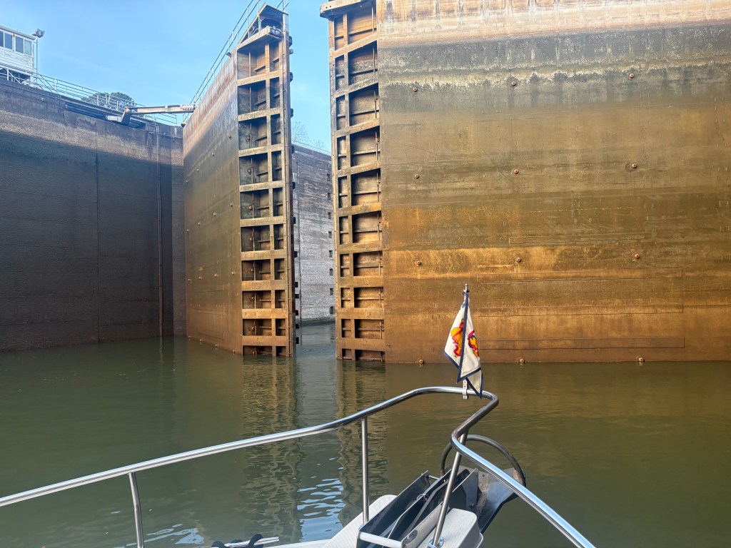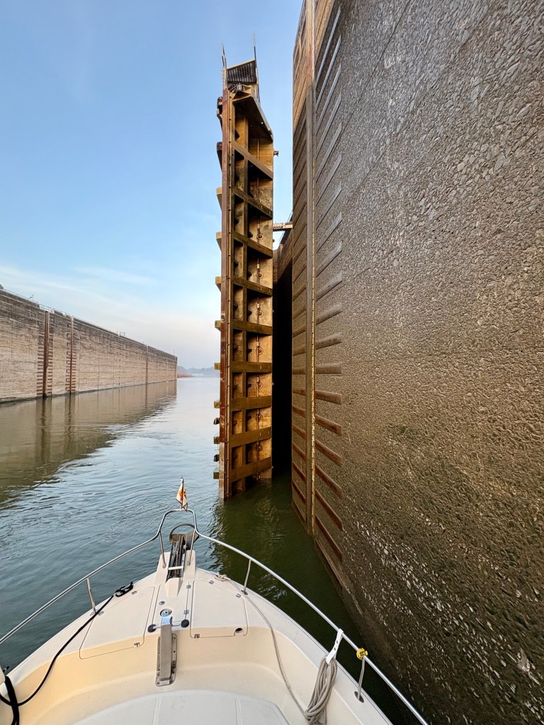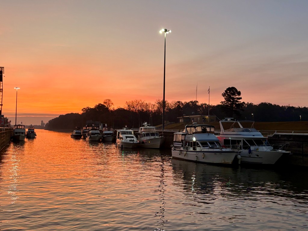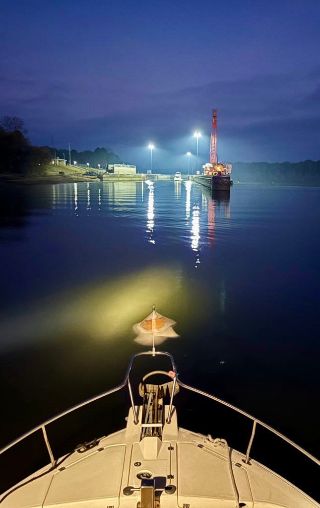 Kingfisher Bay Marina is right outside the Demopolis, AL Lock. We learned that there was work being done on the lock and they wanted all the boats there by 6a (Sunrise is at 6:30a!). We set out in the pitch dark at 5:30a with Dea on a spotlight. We were the 2nd boat of 16 in the lock. We had the small adventure of arriving at our intended lock tie off only to find that 2 of the bollards (the thing we tie off to) were not there! We had to pivot and move to another spot. We were a little annoyed that the lock master couldn’t have warned us in advance! Some of the boats had to “raft” (tie off) to other boats in order to fit us all in the lock.