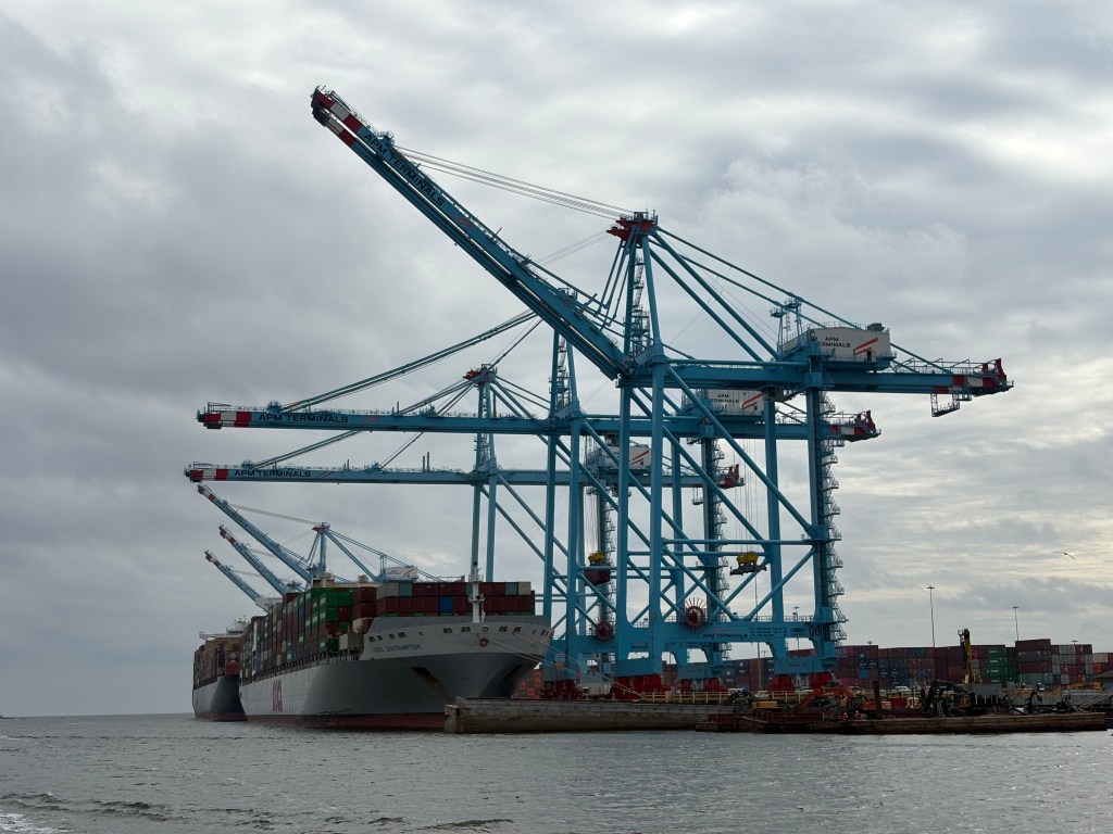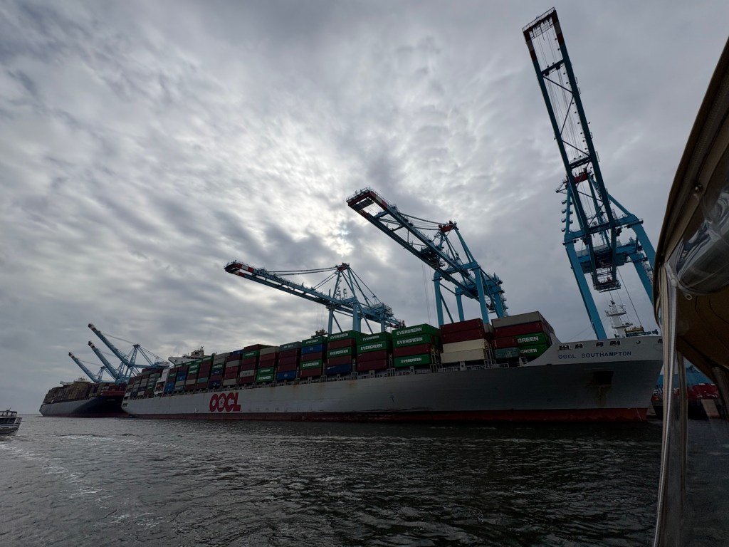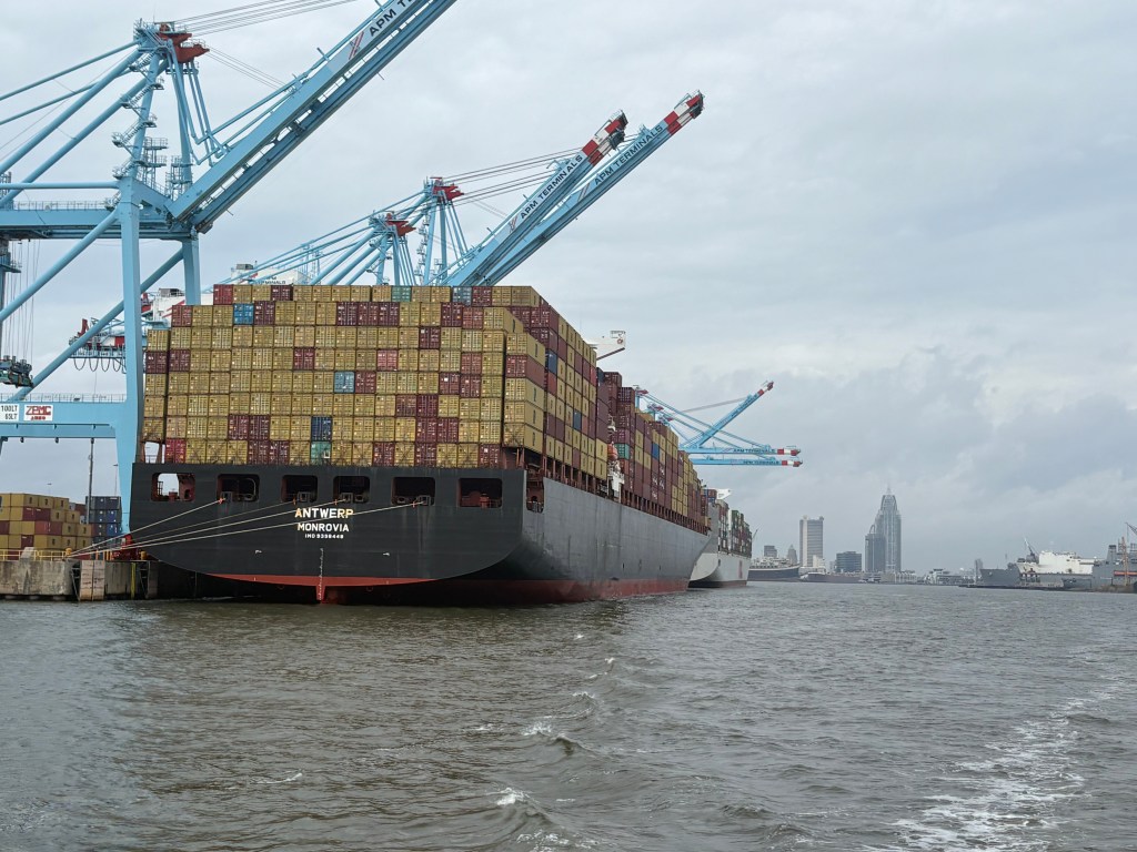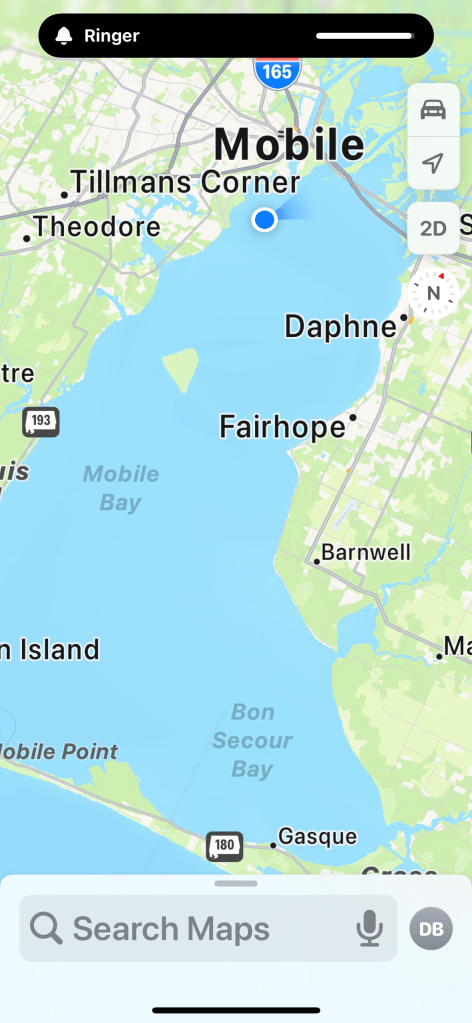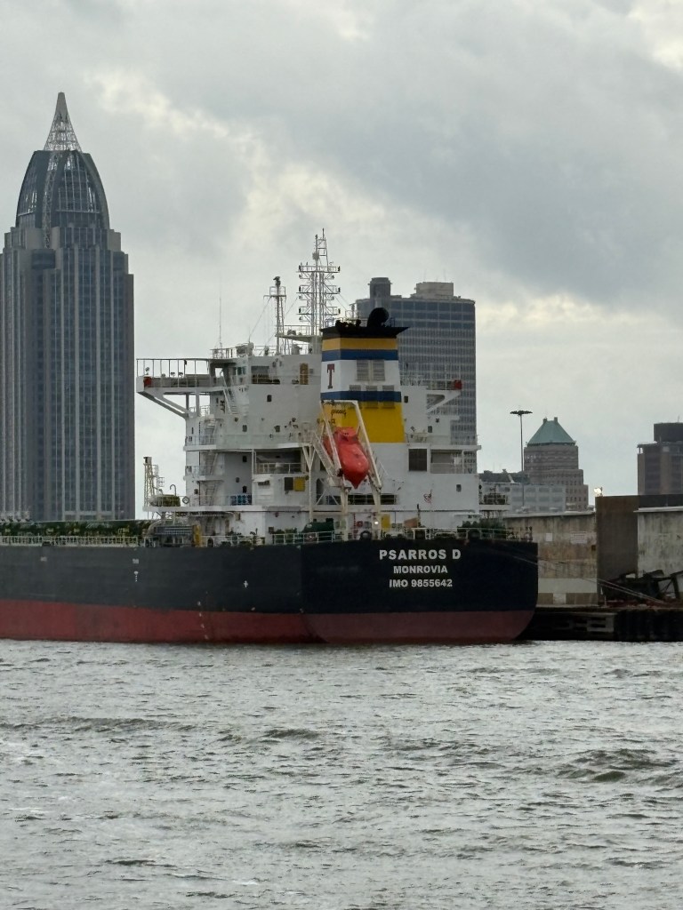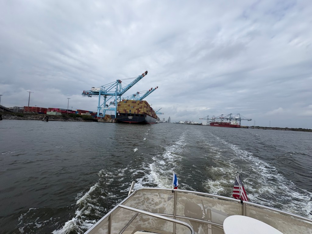 Today was a long but fascinating day! We left our anchorage under good conditions, but then hit some thick fog. We slowed our roll for a few hours until it cleared. We continued south until we hit Mobile, AL. It was FASCINATING to see the industrial complex up close. Most interesting was the cranes unloading shipping containers off huge ships straight onto trucks.